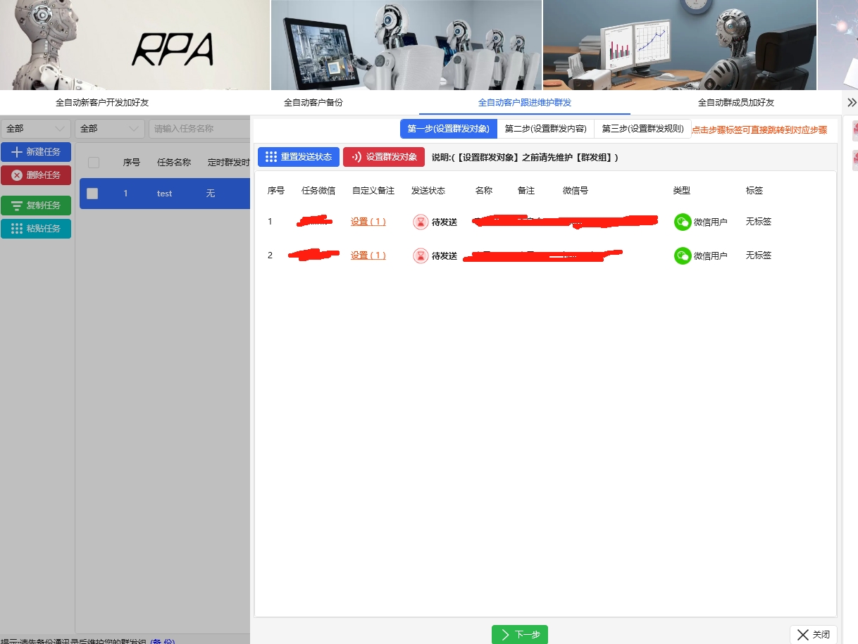 2.自动多号轮流加群好友.支持标签、 验证语自定义。 安全规则与自动加好友一样设置只要人在群里,不被T就可以一直加完,支持每个群验证语和标签不同单独创建任务不支持一键导出群好友微信号,