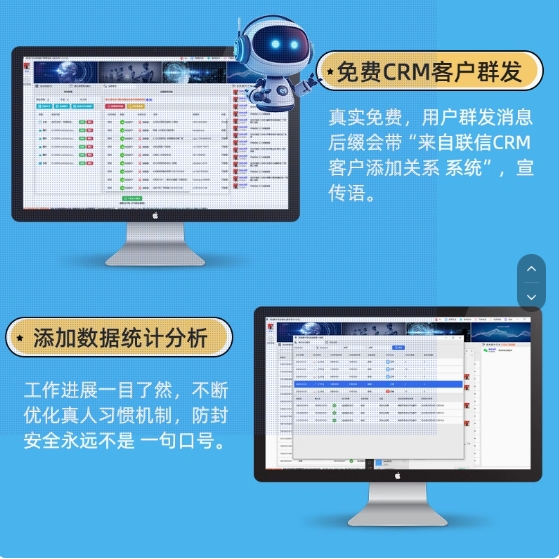 4.CRM 好友和群聊一对一群发,自动全年客户跟进维护群发,支持计划群发.节假日自动给客户打招呼.支持立即群发.您的产品可以直达行业客户眼前.支持分组.标签设置.支持模糊匹配删除不发送好友.支持群聊和好友发送.支持文字.表情.图片.视频.文件.网址链接等发送支持自动清理僵尸粉.